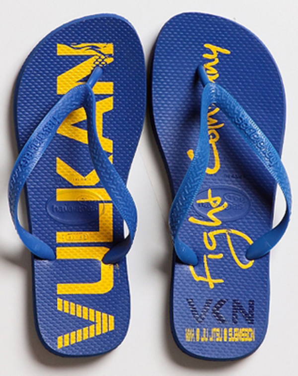 ビビッドな黄色のVUKAN ブルカンロゴが入ったビーチサンダル。 市場価格3500円のところ弊店価格は30%超オフ ソール幅は約1.8cmと高く、安定も良く履き安い天然ゴム100%です。 ビーチに道場に普段履きに今年の夏の一足に是非加えて頂きたい! このハワイアナスとブルカンのコラボは他では滅多に見られない非常にレアなデザインです。 日本サイズは下記を参考にしてください。 37/38 (23.5cm-25.0cm) 39/40(25.0cm-26.5cm)