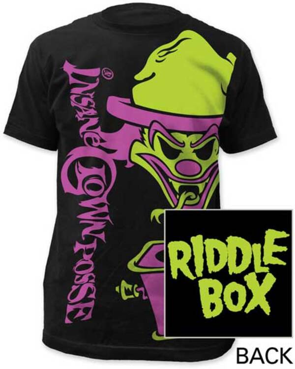 色:黒 /Black 素材:綿100% インセイン・クラウン・ポッシー(Insane Clown Posse)のRiddle BoxのTシャツ。柔らかい生地で着やすいです。 ICPは、アメリカ合衆国のホラーコア・デュオ。プロレスECWへのゲスト参加、1998年のWWE登場、1999年のWCW参戦などプロレス業界に進出、1999年ハードコア系のインディープロレス団体JCW(Juggalo Championship Wrestling)を設立。彼ら自身も時折選手として試合に出場、ネット中継での実況解説も担当。WCWではヴァンピーロと共闘。短期間ではあるがグレート・ムタもこれに参加していた。(wikipediaより)